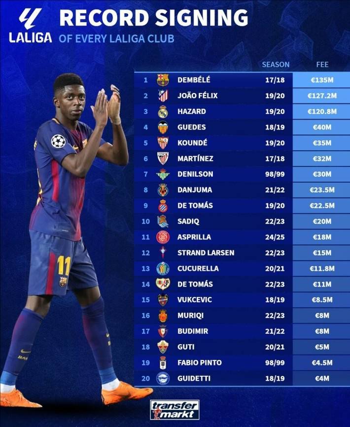 直播吧7月16日讯 不久前,德国转会市场统计了新赛季西甲20队的队史标王,其中巴萨的登贝莱居首,马竞的菲利克斯和皇马的阿扎尔紧随其后。